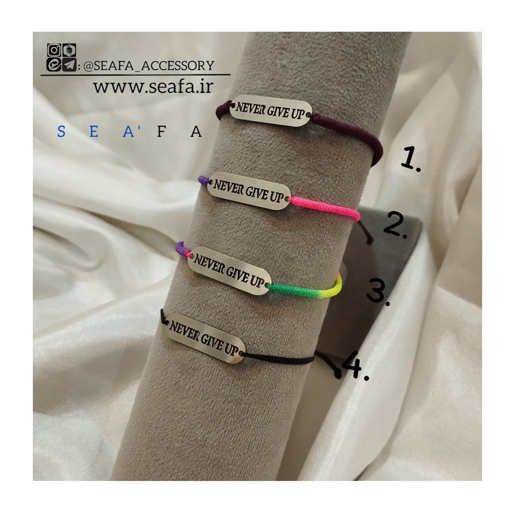 دستبند نخی با پلاک استیل – NEVER GIVE UP